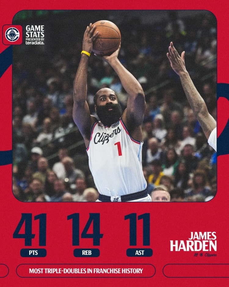 Tại NBA Cup kết thúc ngày hôm qua, Clippers đã đánh bại Mavericks với tỷ số 133-127 trong hai hiệp phụ, chấm dứt chuỗi sáu trận thua của họ. Harden chơi 51 phút, sút 13 trên 25, 6 trên 12 quả ba điểm, 9 trên 11 quả ném phạt, ghi 41 điểm, 14 rebound, 11 kiến tạo, 1 cướp và 2 cản phá!