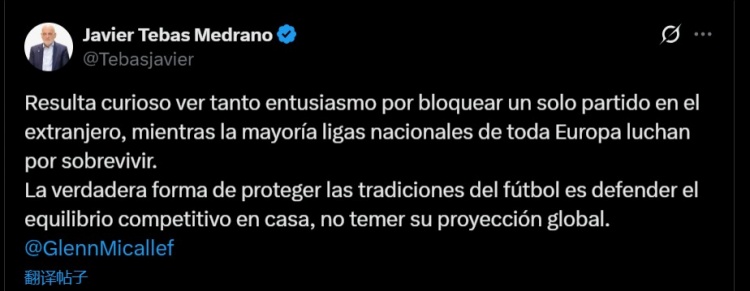 Tebas viết: "Thật tò mò muốn biết mọi người muốn ngăn cản một trận đấu ở nước ngoài đến mức nào, trong khi cùng lúc đó, hầu hết các giải đấu trong nước trên khắp châu Âu đang phải vật lộn để tồn tại."