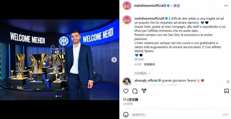 "Inter Milan sẽ luôn ở trong trái tim tôi. Với lòng biết ơn, tôi chia tay tất cả các bạn và chúc bạn vinh dự hơn trong tương lai! Làm điều này với cảm xúc. - Mehdi Taremi."