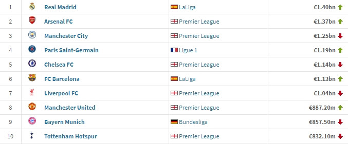 Theo số liệu thống kê mới nhất từ Đức, bảng xếp hạng giá trị câu lạc bộ thế giới cũng đã thay đổi: