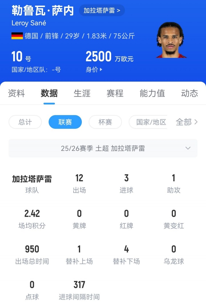 Sane đã chơi 15 trận cho Galatasaray mùa này, đóng góp 3 bàn thắng và 2 đường kiến tạo, trong đó có 3 bàn thắng và 1 đường kiến tạo sau 12 vòng đấu ở Giải VĐQG Thổ Nhĩ Kỳ.