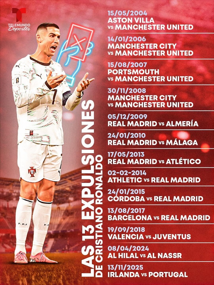Cristiano Ronaldo đã bị nhuộm đỏ 12 lần trước đó như sau: