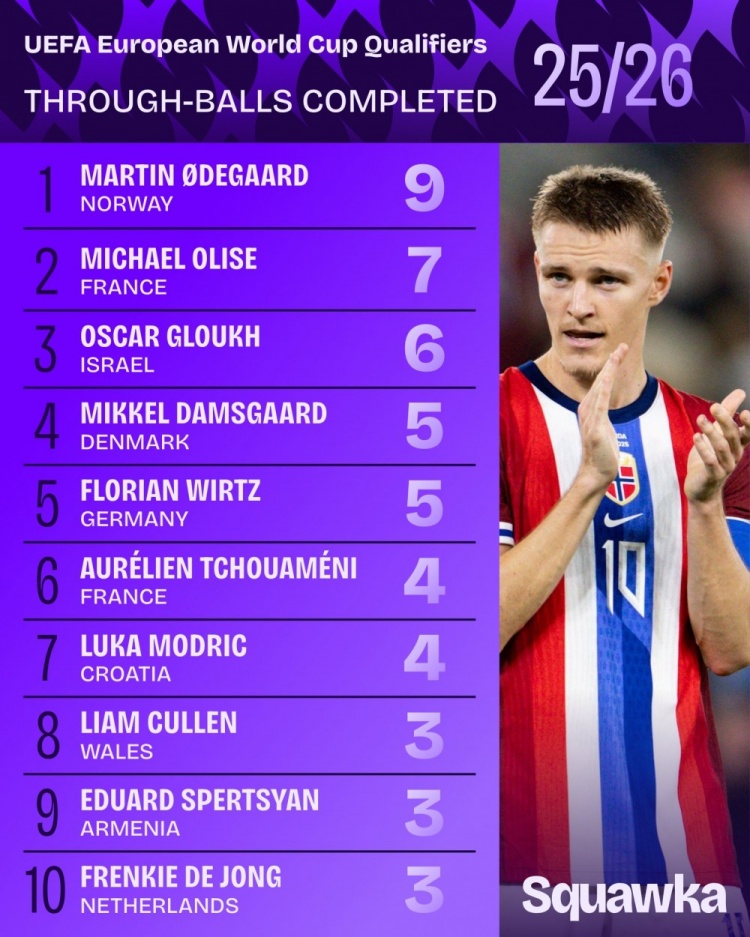 Vòng bảng vòng loại Châu Âu Thế giới này đã kết thúc. Squakwa cũng tính số đường chuyền trong giải đấu này, với Odegaard dẫn đầu.
